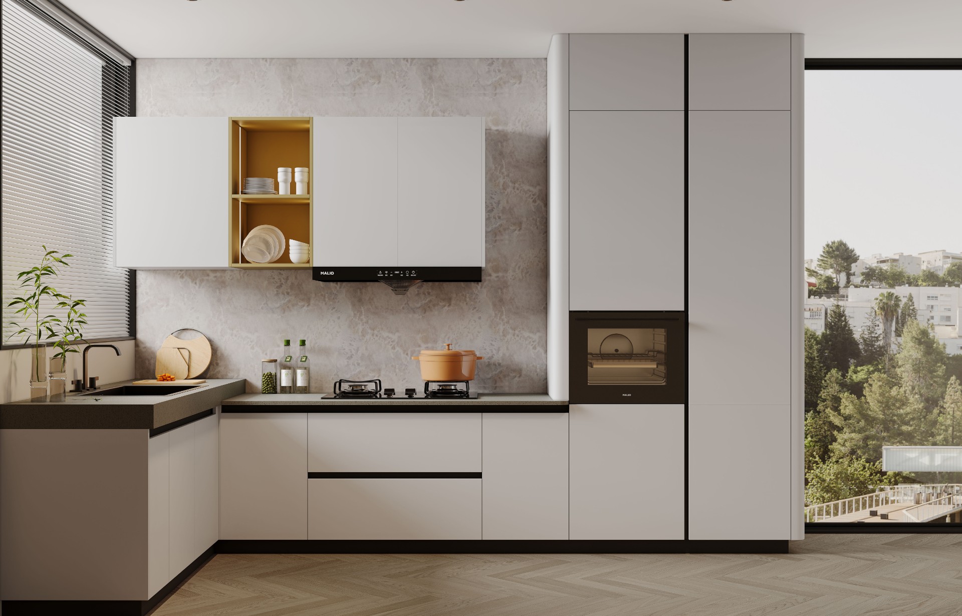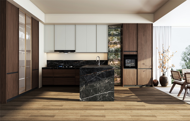 通過尊龍集團廚柜量體裁柜,定制出適合主廚下廚的烹飪區(qū)和洗滌區(qū)的舒適高度。